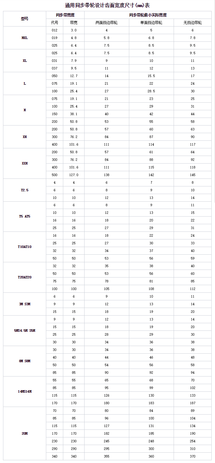 通用同步帶輪設(shè)計齒面寬度尺寸(mm)表